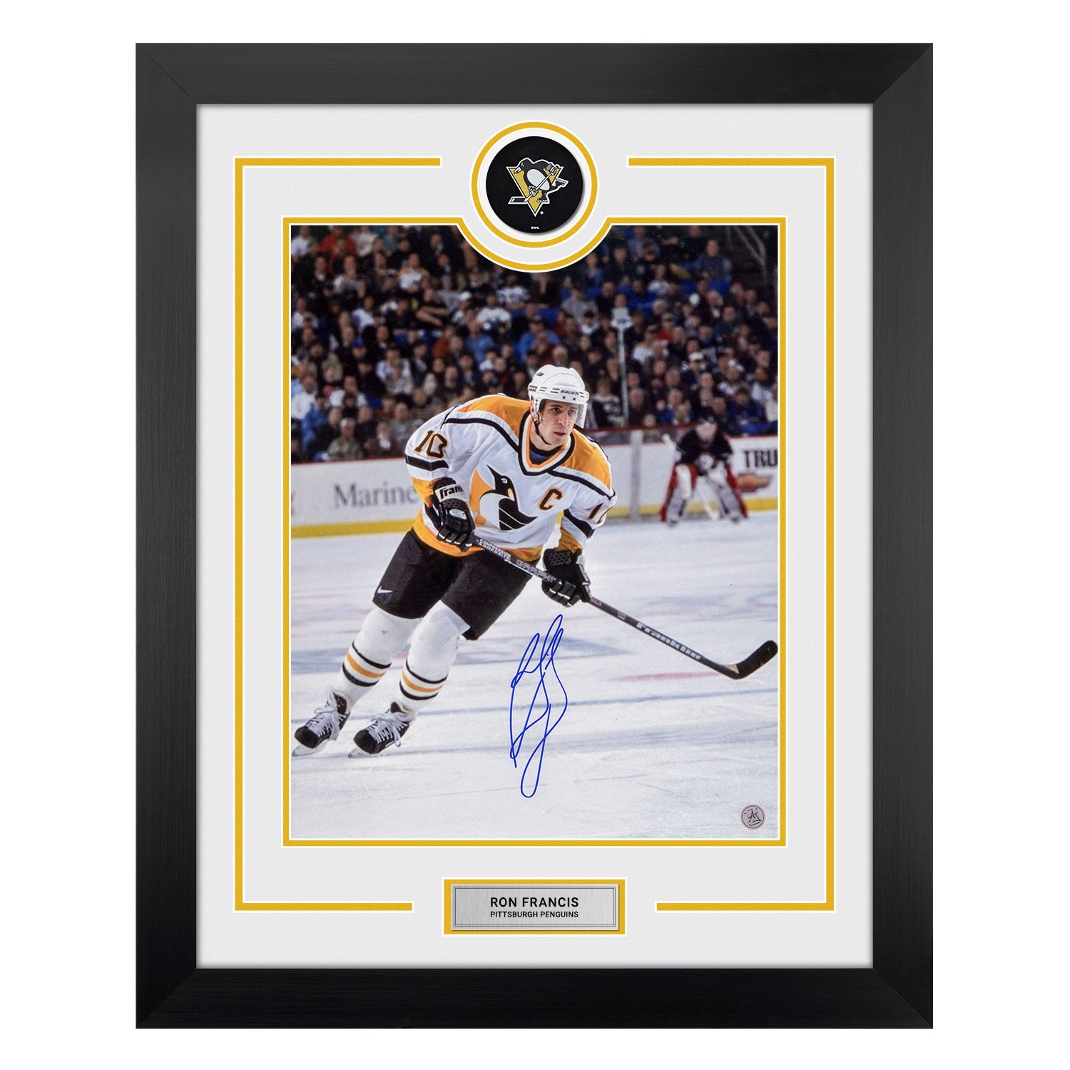 Ron Francis Autographed Pittsburgh Penguins Puck Logo 26x32 Frame