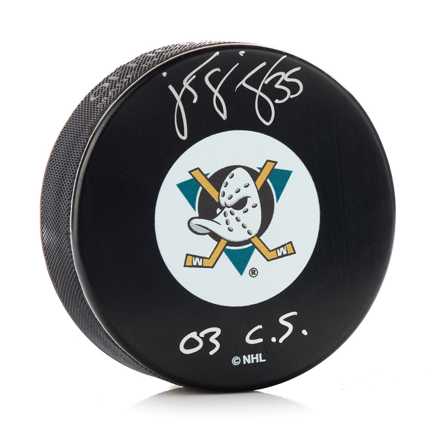 JS Giguere Signed Anaheim Mighty Ducks Puck with 03 Conn Smythe Note