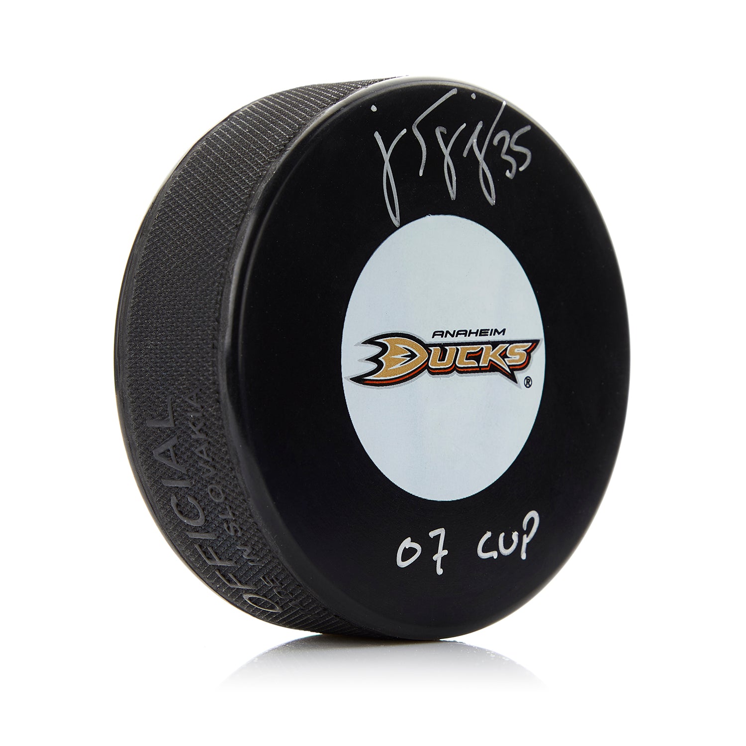 JS Giguere Signed Anahiem Ducks Hockey Puck with 07 Cup note