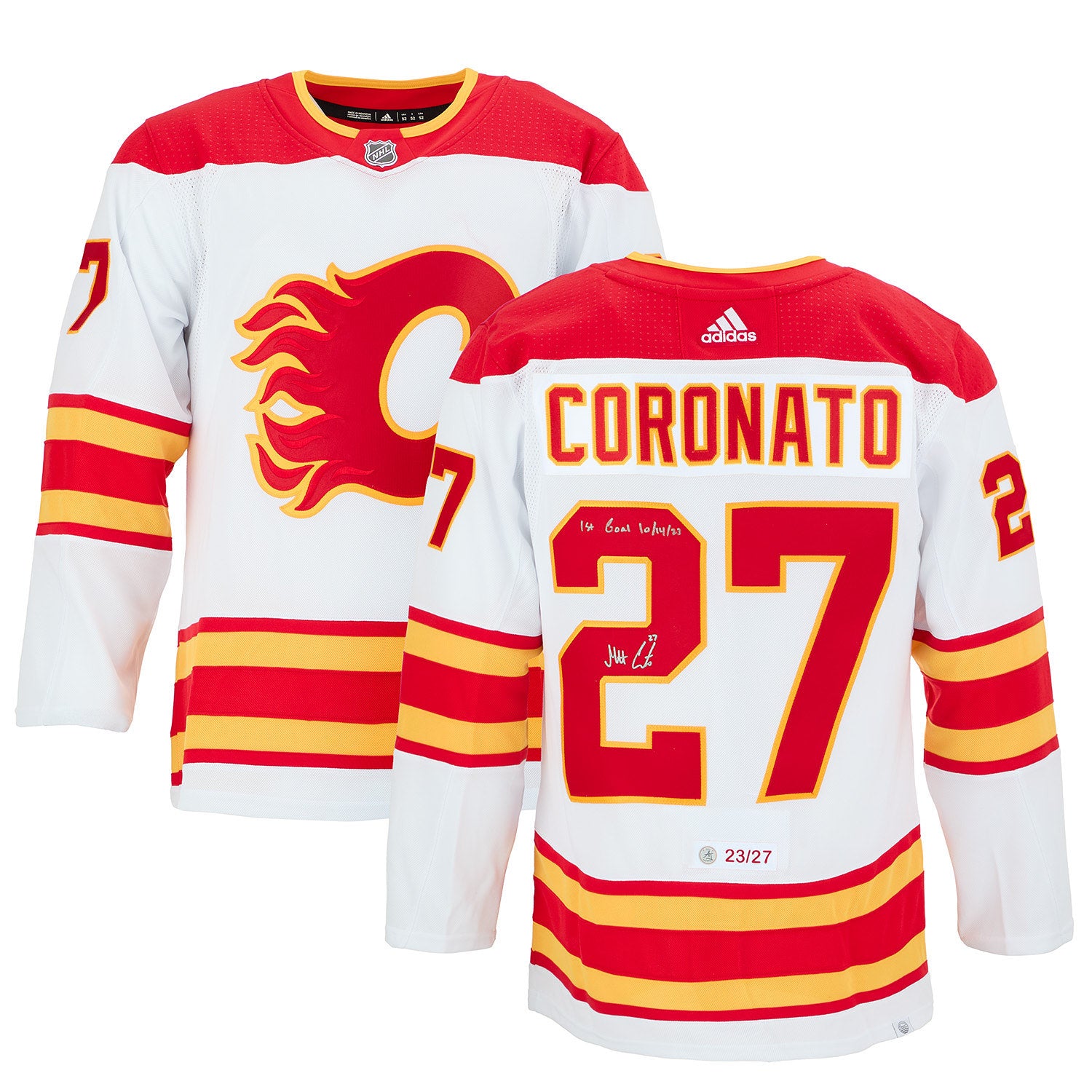 Matt Coronato Signed Calgary Flames White adidas Jersey with 1st Goal Note #/27