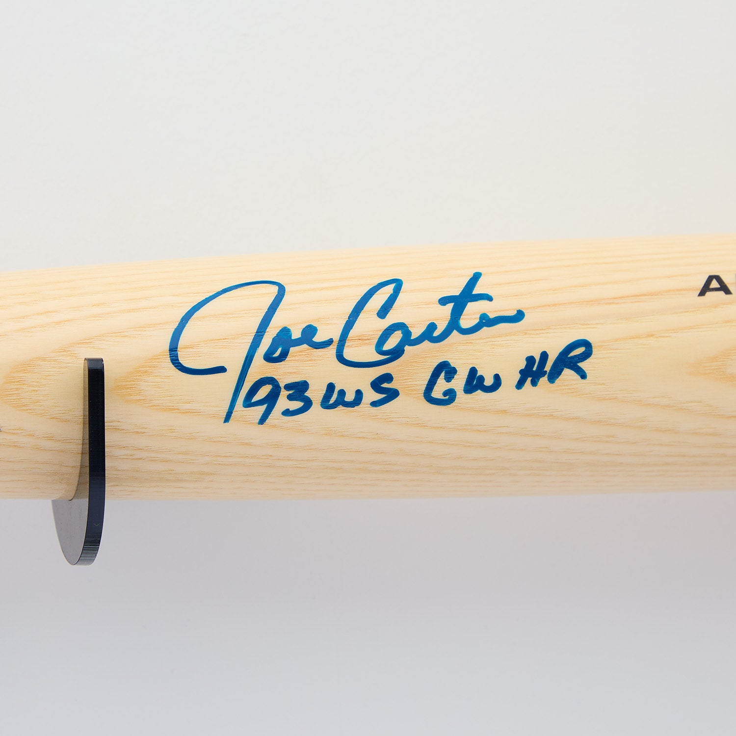 • This baseball bat is signed and inscribed with 93 WS GW HR by Joe Carter.