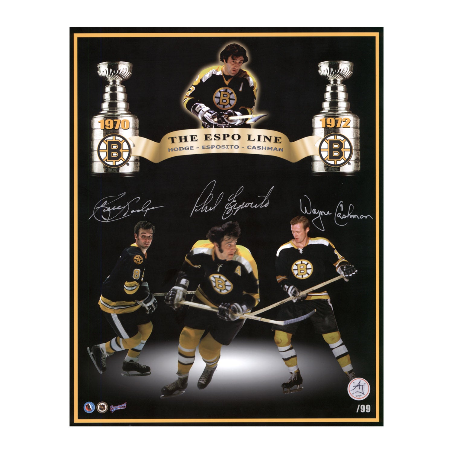 Phil Esposito, Ken Hodge & Wayne Cashman Signed Boston Bruins Collage 11x14 Photo #/99