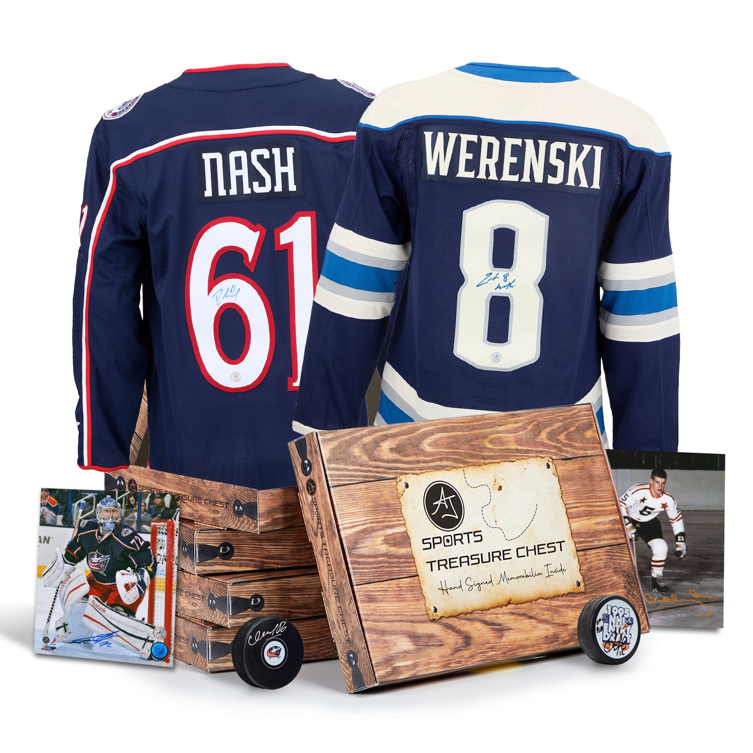 This series features unique autographs from a variety of hockey players, stars and legends. Please note this is a mystery product and there is no guarantee of any specific advertised treasure in any individual chest. Each chest contains randomly inserted memorabilia from the series. Each Treasure Chest is packed, sealed and mixed at our headquarters. There are no returns, refunds or exchanges on Treasure Chest products. AJ Sports offers a 60 day warranty on any product defects.