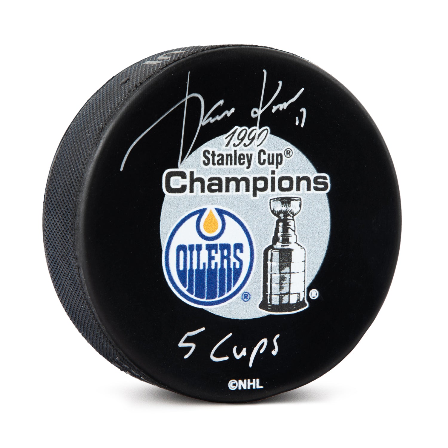 • Jari Kurri signed and inscribed with puck with 5 Cups inscription.