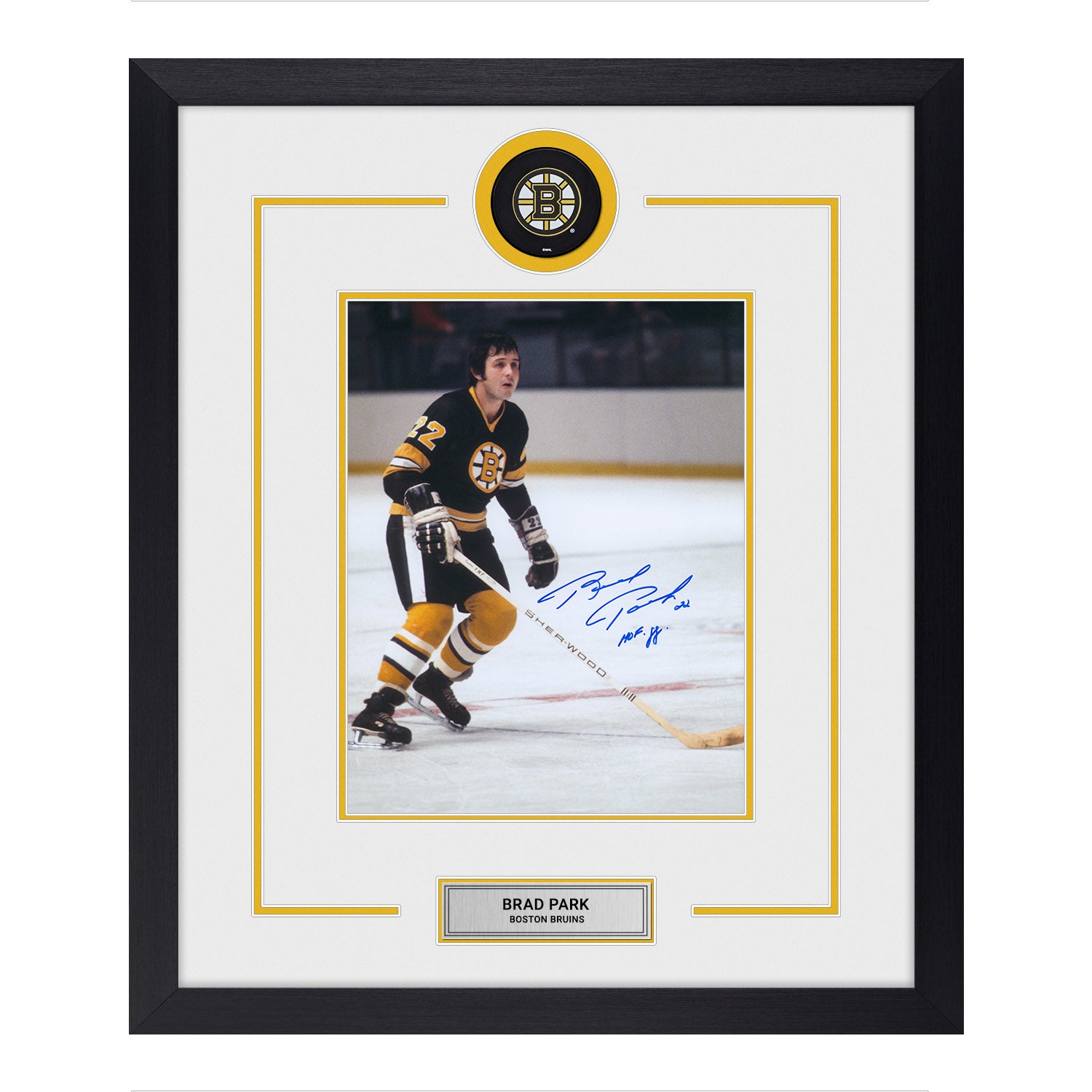 Brad Park Autographed Boston Bruins Puck Logo 23x27 Frame