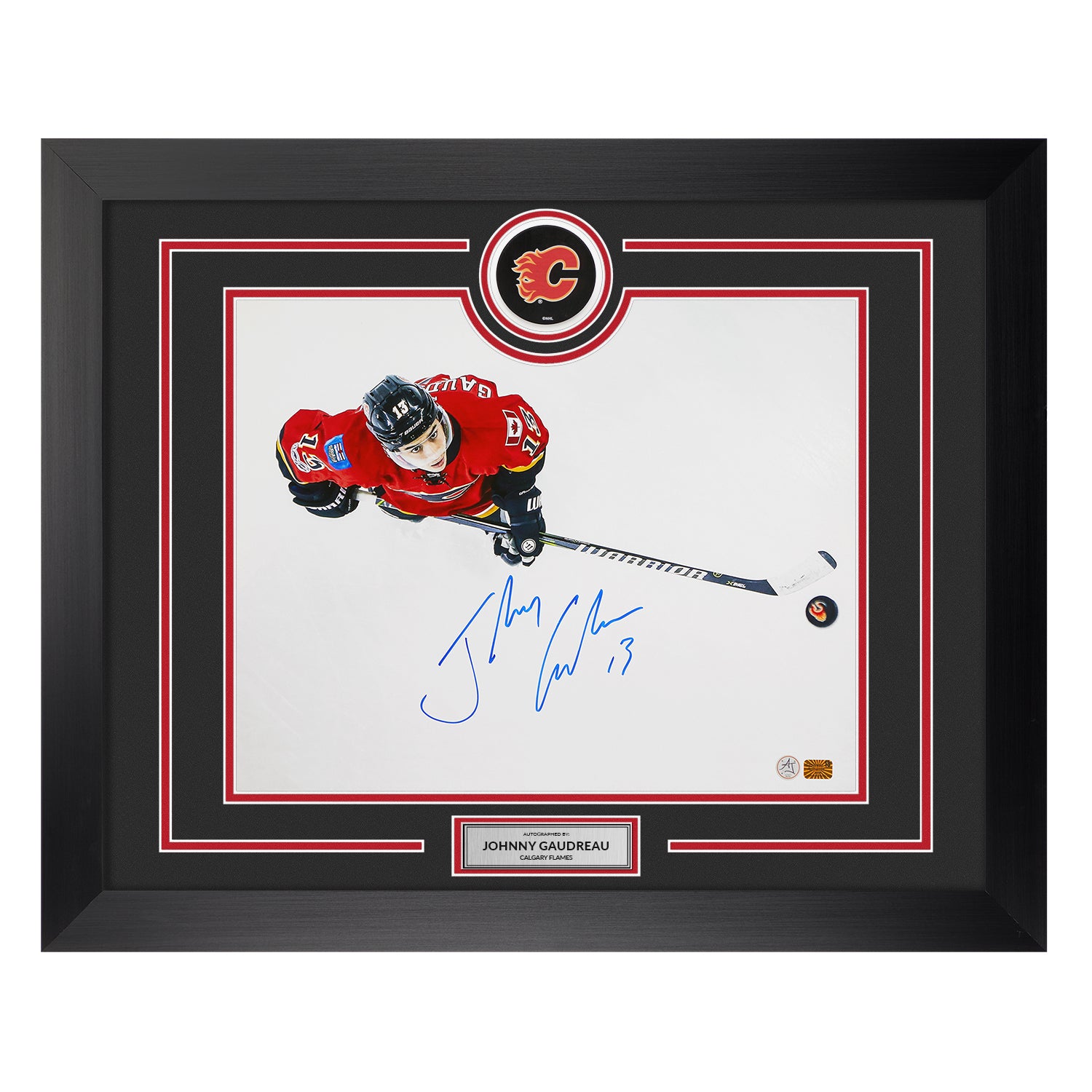 Johnny Gaudreau Signed Calgary Flames Puck Logo 26x32 Frame