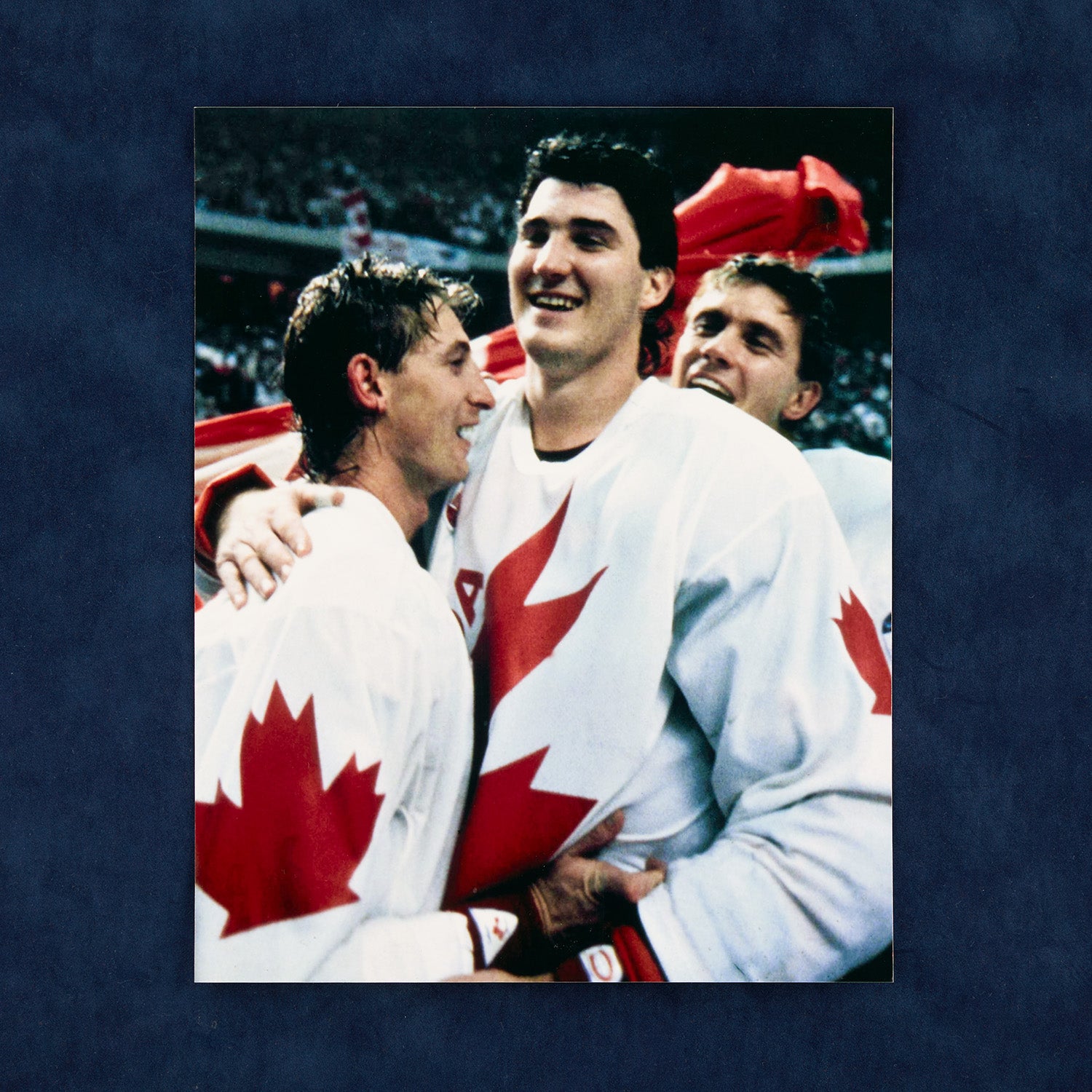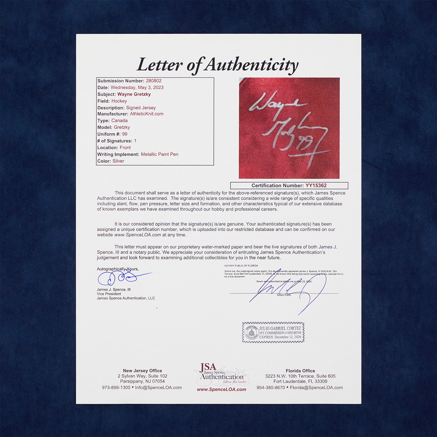 “The Great One” has beautifully hand-signed this very unique white Team Canada jersey in a silver marker. All numbers, letters and patches have been professionally hand-sewn onto the jersey which has been beautifully signed on the front. The jersey comes with a fight strap and is a size Large.Authentication: This signature has been certified and authenticated by (JSA) James Spence Authentication and comes with their unique numbered sticker (affixed to the jersey) and full, detailed Letter of Authenticity. JSA is widely regarded as one of the world's premier and most reputable autograph authentication services. The jersey will come with an unsigned 8x10 photo as shown of Gretzky and Lemieux celebrating the victory.This pro-weight white knit replica jersey has the fight strap with all crests and numbers sewn on.When reminiscing about the 1987 Canada Cup, Wayne Gretzky has said "I don't think you'll ever see better hockey than what was played in that series. For me, it was probably the best hockey I've ever played." Canada captured tournament honors, defeating the Soviets 5-4 in the third and deciding game of the finals after Mario Lemieux scored on a drop pass from Wayne. Gretzky played 20 seasons in the NHL for four teams from 1979 to 1999. Gretzky is the leading scorer in NHL history, with more goals and assists than any other player. He is the only NHL player to total over 200 points in one season – a feat he accomplished four times. In addition, Gretzky tallied over 100 points in 16 professional seasons, 14 of them consecutive. At the time of his retirement in 1999 and persisting through 2017, he holds 61 NHL records: 40 regular season records, 15 playoff records, and six All-Star records. Born and raised in Brantford, Ontario, Gretzky honed his skills at a backyard rink and regularly played minor hockey at a level far above his peers. Gretzky's intelligence and reading of the game were unrivaled.Product images display the exact item offered for sale.
