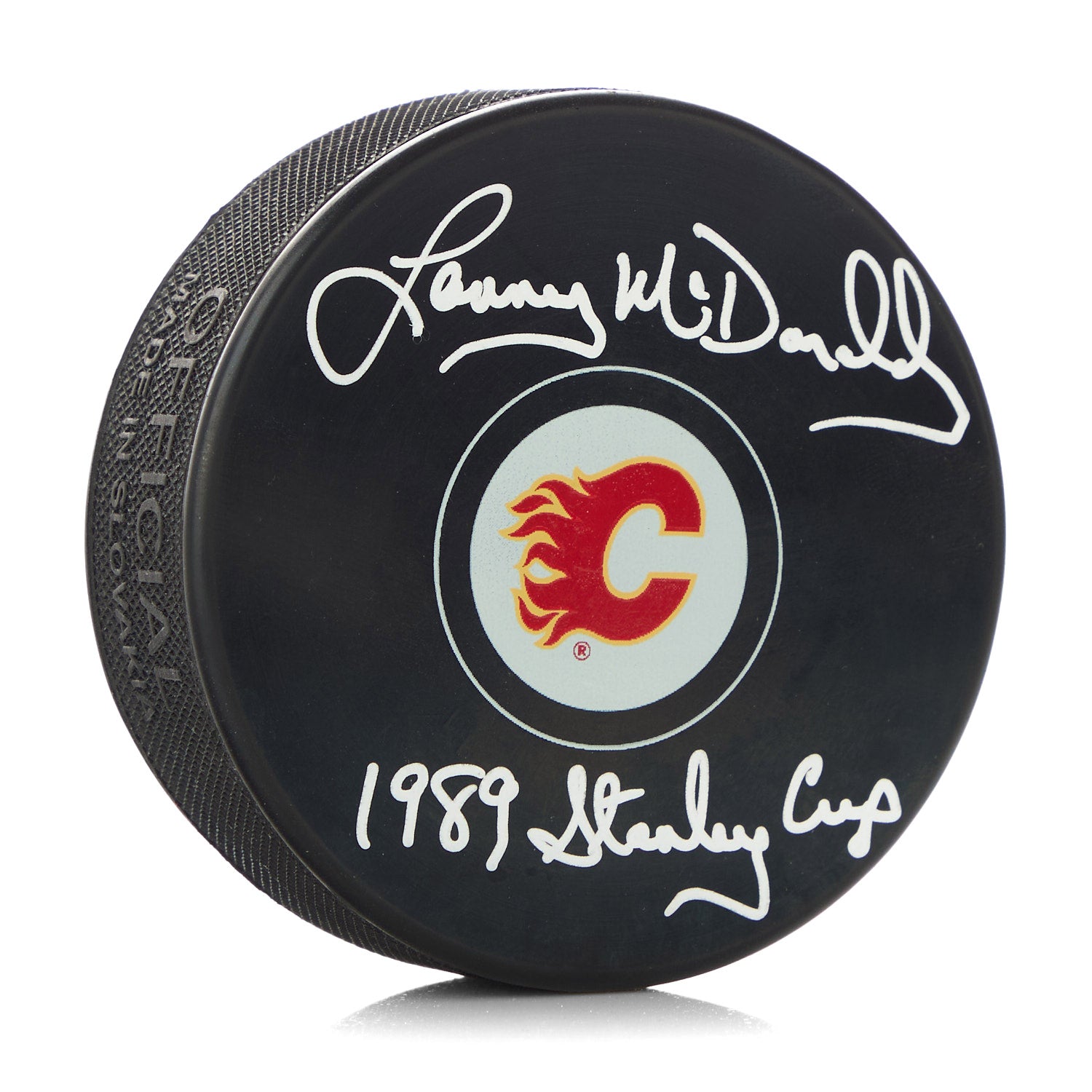 Lanny McDonald Signed Calgary Flames Hockey Puck with 1989 Stanley Cup Note