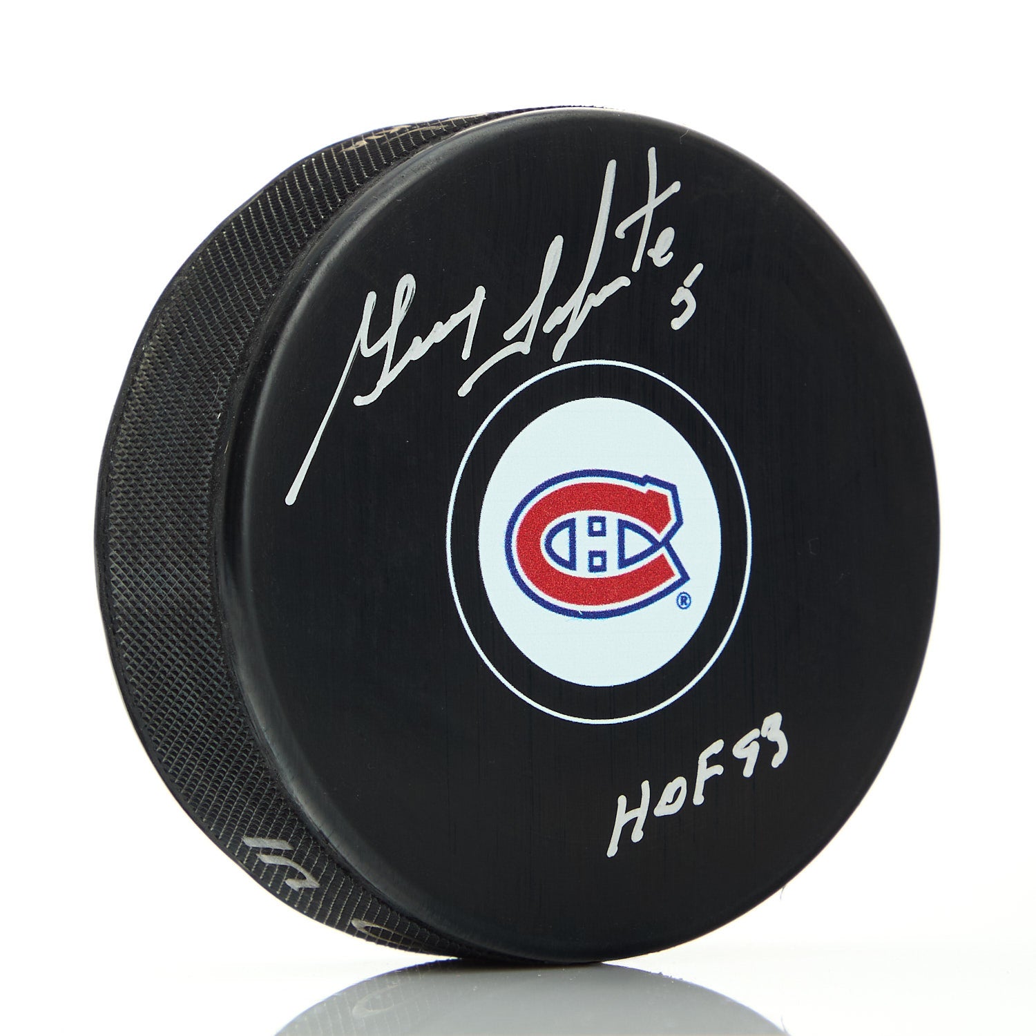 - This puck is signed and inscribed with HOF by Guy Lapointe.