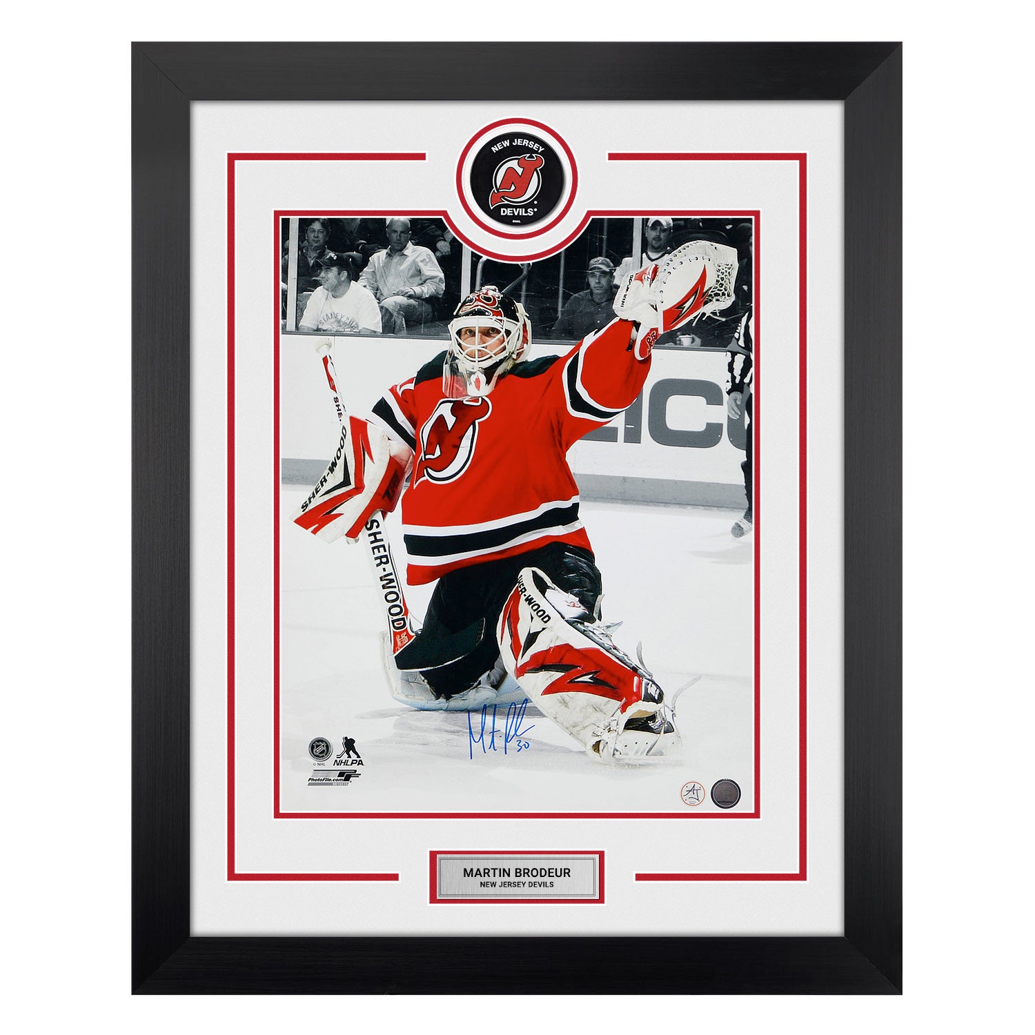 Martin Brodeur Autographed New Jersey Devils Puck Logo 26x32 Frame