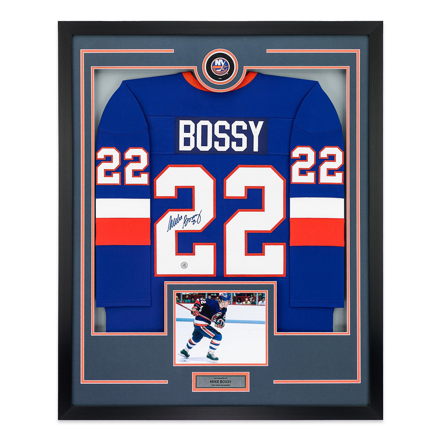 • The jersey in this frame is hand-signed by Mike Bossy.