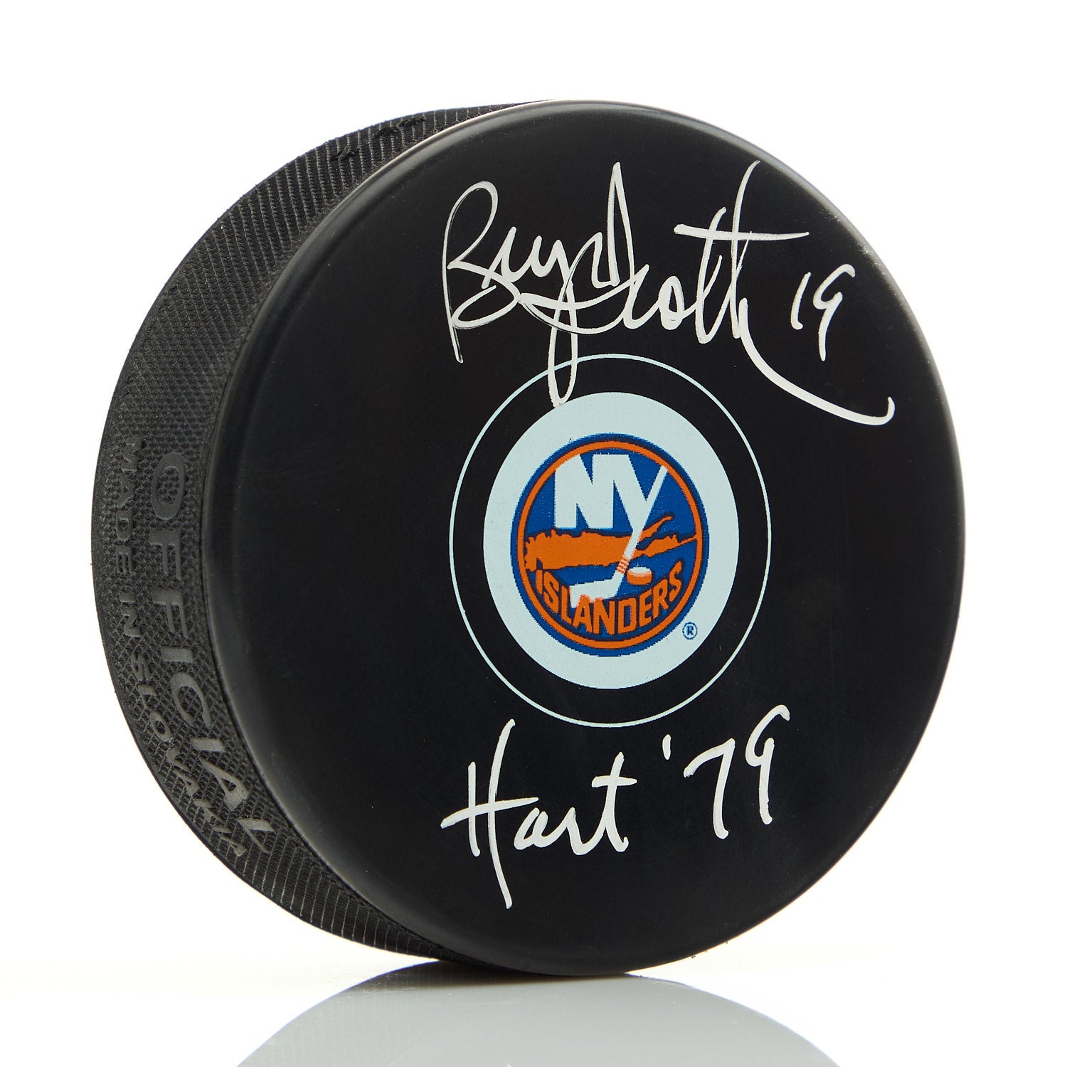 Bryan Trottier Autographed New York Islanders Hockey Puck with 79 Hart Note