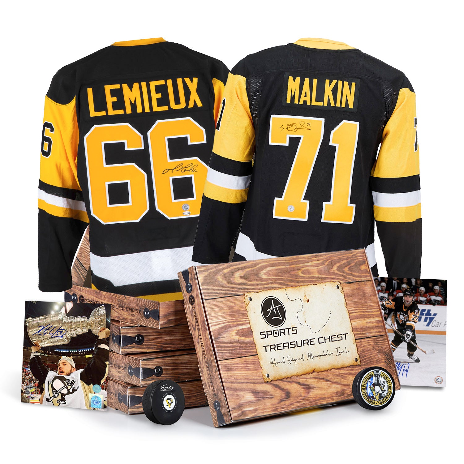 • Each sealed Pittsburgh Hockey Hat Trick Treasure Chest contains an autographed hockey jersey, autograph puck and autographed 8x10 photo.