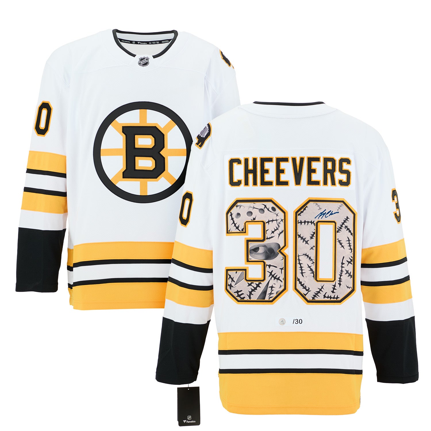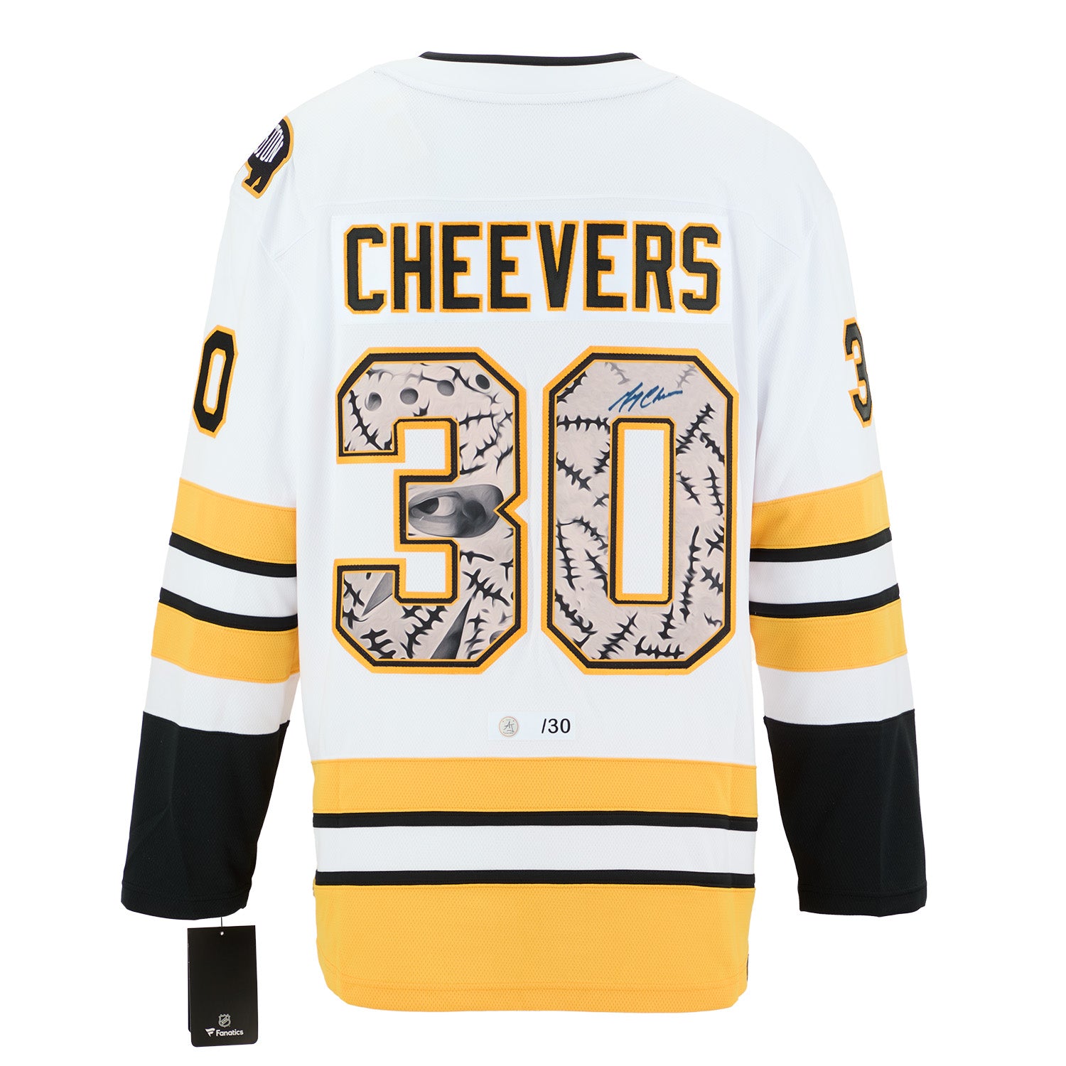 • This hockey jersey is hand-signed by Gerry Cheevers.