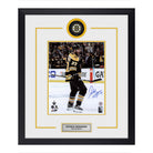 • Patrice Bergeron Hand-Signed 11x14 Photo Mounted in a Classic Display frame featuring a licensed Boston Bruins puck logo display