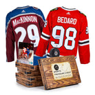 This series features unique autographs from a variety of hockey players, stars and legends. Please note this is a mystery product and there is no guarantee of any specific advertised treasure in any individual chest. Each chest contains randomly inserted memorabilia from the series. Each Treasure Chest is packed, sealed and mixed at our headquarters. There are no returns, refunds or exchanges on Treasure Chest products. AJ Sports offers a 60 day warranty on any product defects.