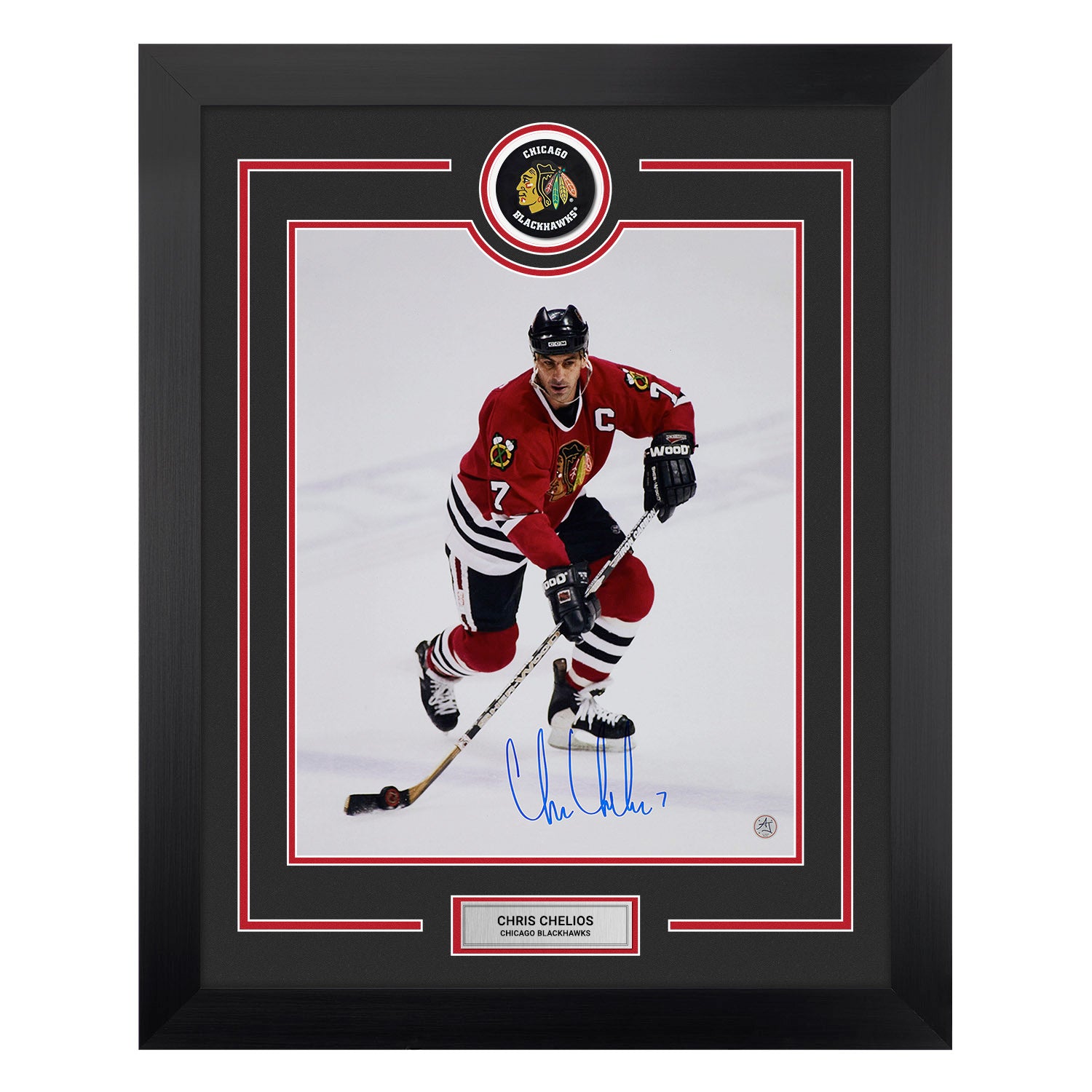 Chris Chelios Signed Chicago Blackhawks Puck Logo 26x32 Frame