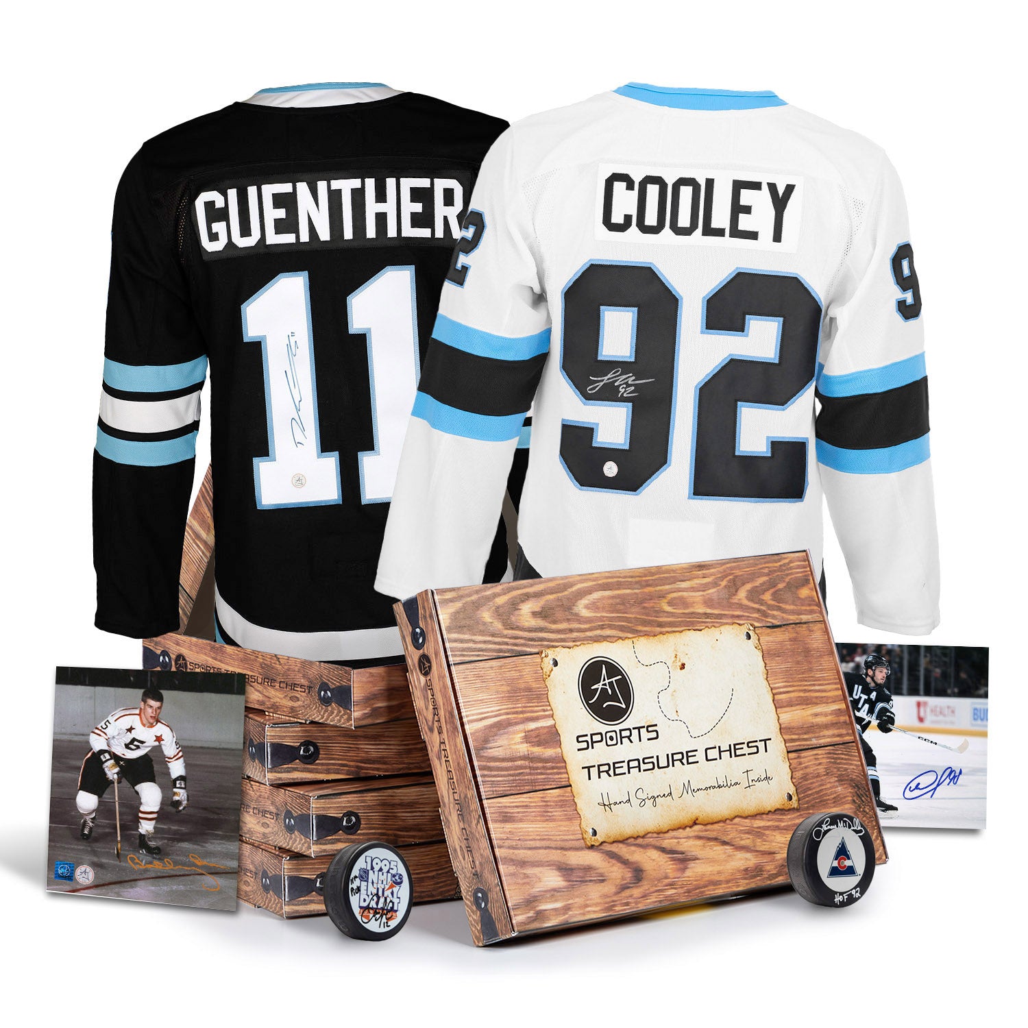 • Each sealed Utah Hockey Hat Trick Treasure Chest contains an autographed hockey jersey, autograph puck and autographed 8x10 photo.
