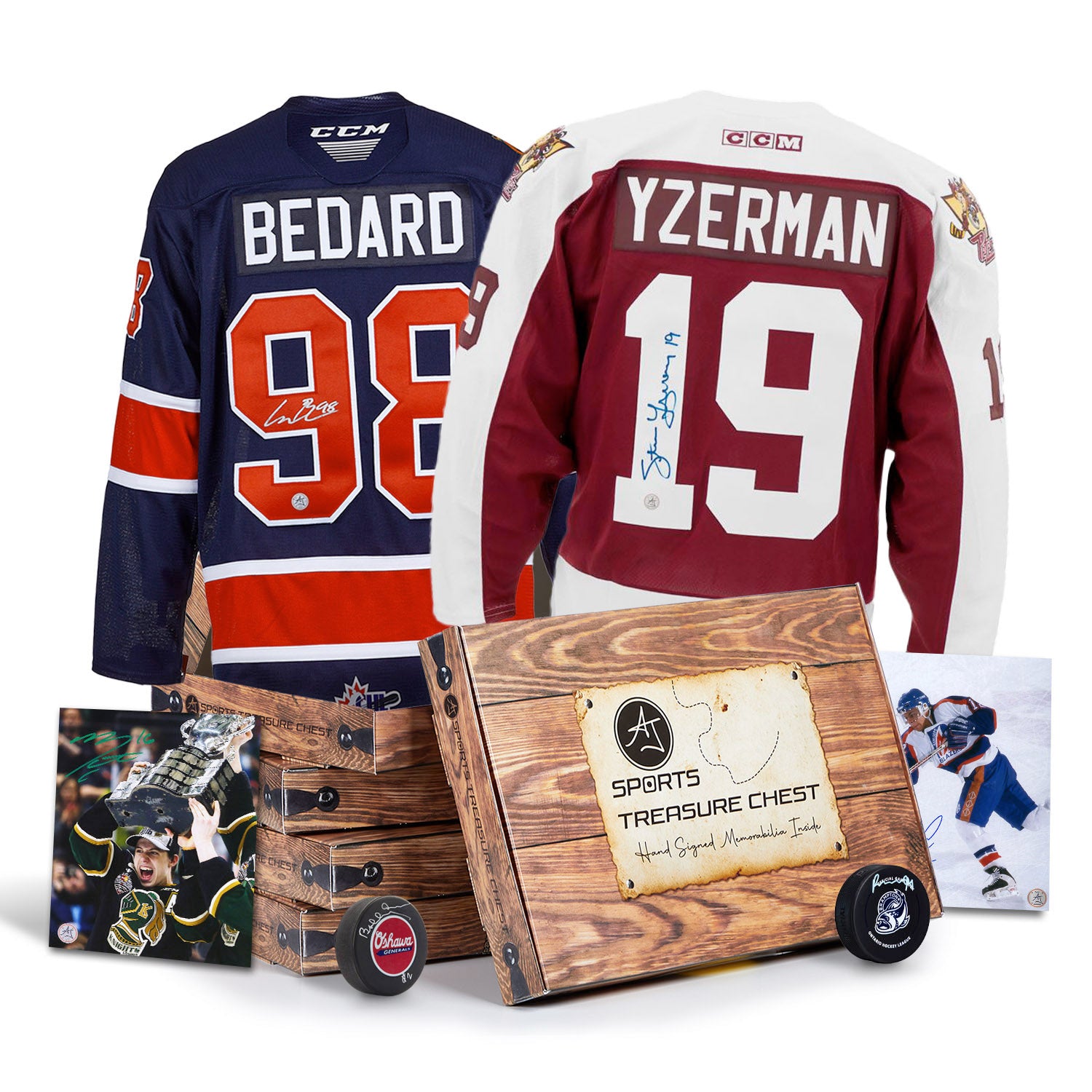 This series features unique autographs from a variety of hockey players, stars and legends. Please note this is a mystery product and there is no guarantee of any specific advertised treasure in any individual chest. Each chest contains randomly inserted memorabilia from the series. Each Treasure Chest is packed, sealed and mixed at our headquarters. There are no returns, refunds or exchanges on Treasure Chest products. AJ Sports offers a 60 day warranty on any product defects.