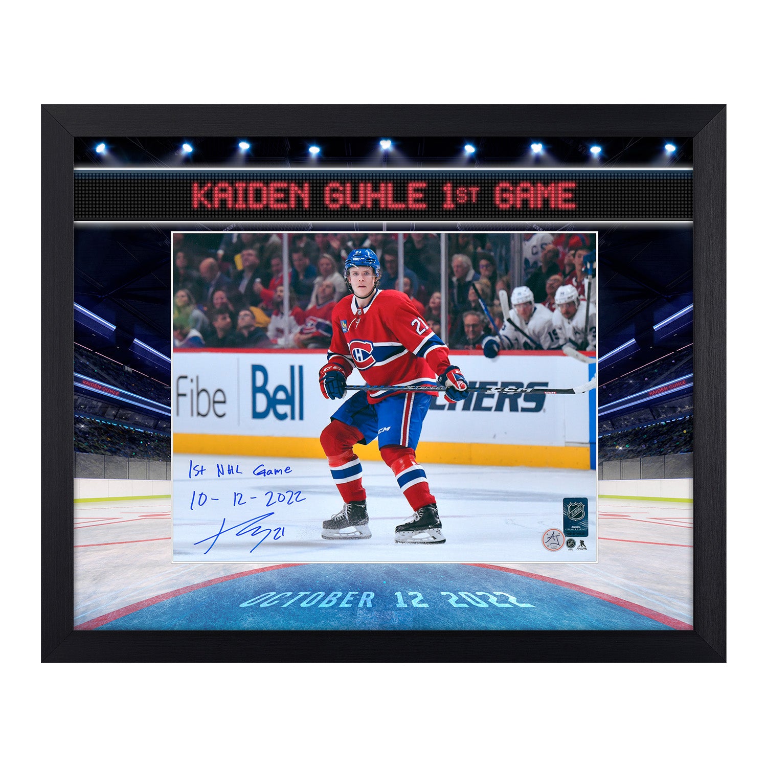 Kaiden Guhle Montreal Canadiens Signed & Dated 1st NHL Game Scoreboard Graphic 23x27 Frame #/21
