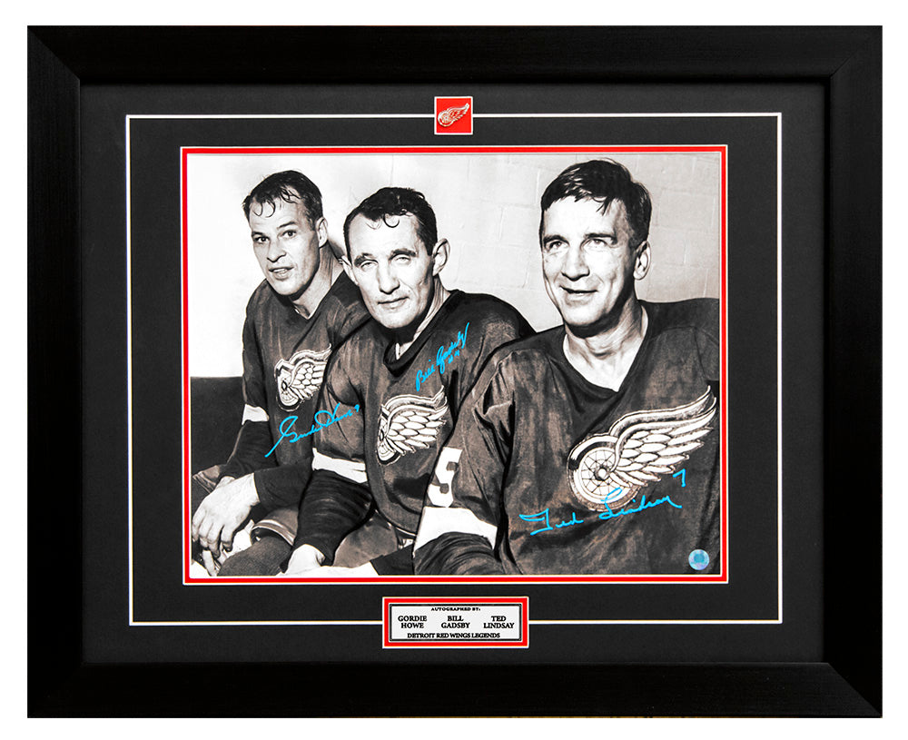 Gordie Howe, Bill Gadbsy & Ted Lindsay Signed Red Wings Legends 26x32 Frame