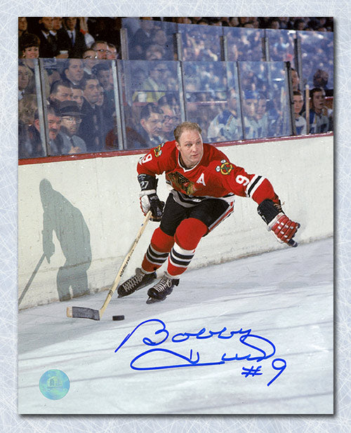 Bobby Hull Autographed Chicago Blackhawks Puck Rush 8x10 Photo
