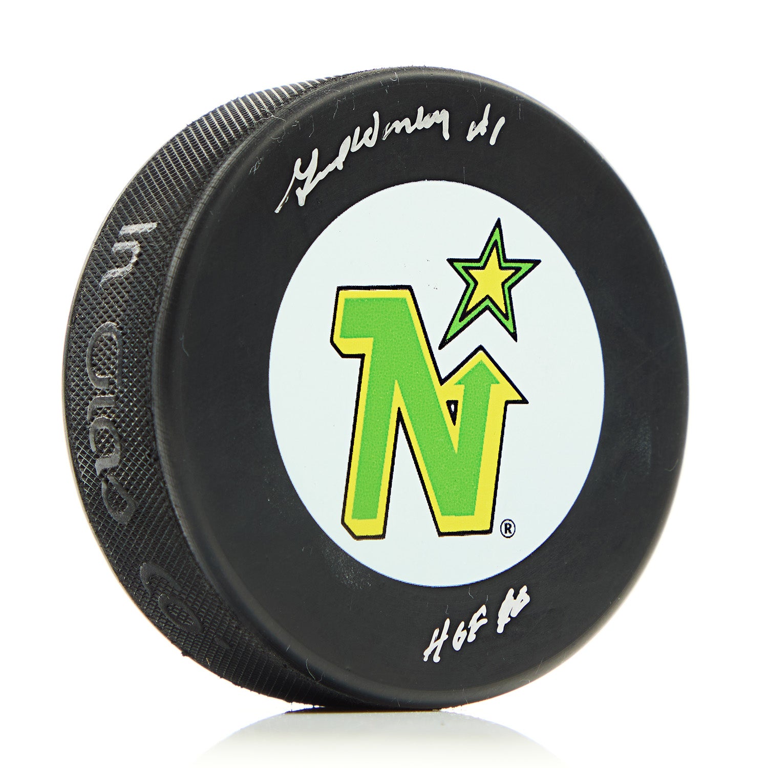Gump Worsley Signed Minnesota North Stars Hockey Puck with HOF Note
